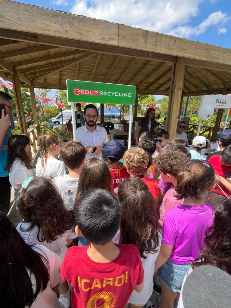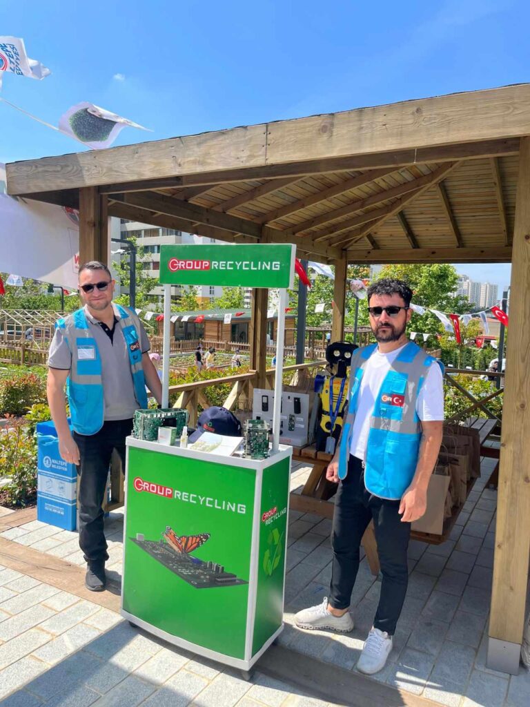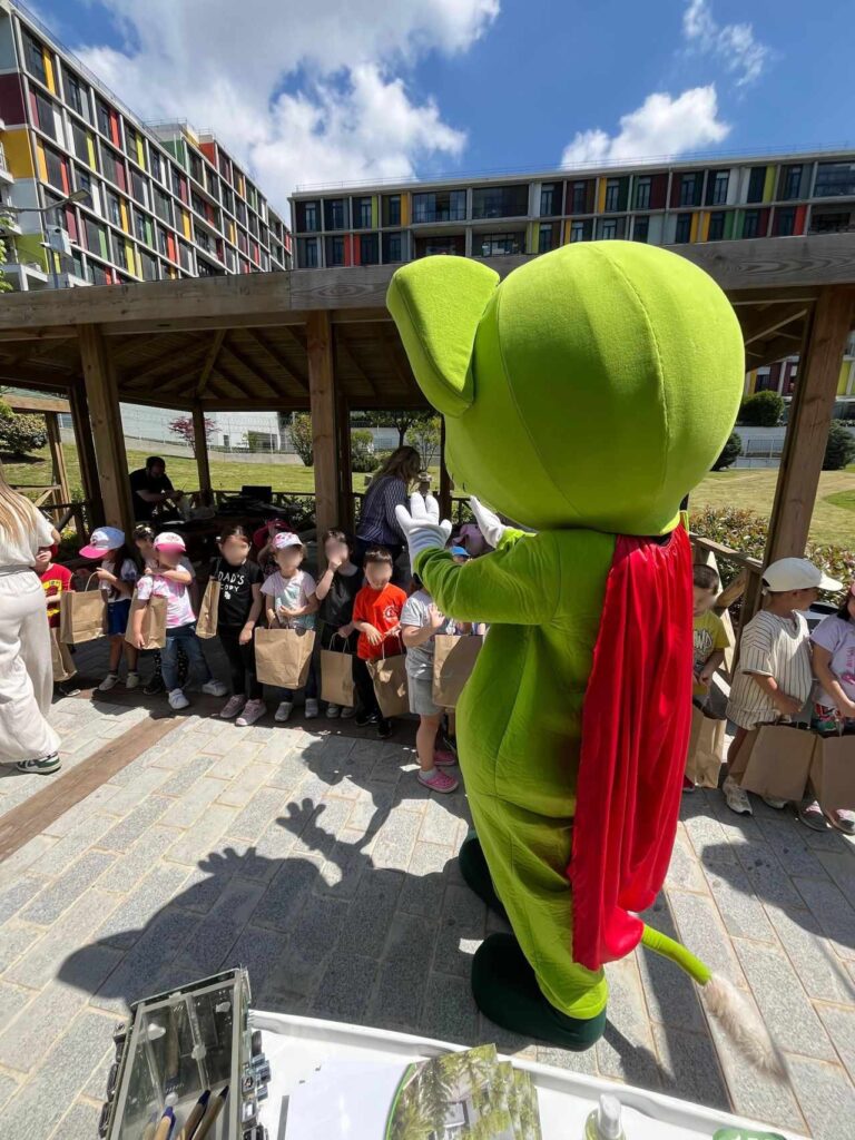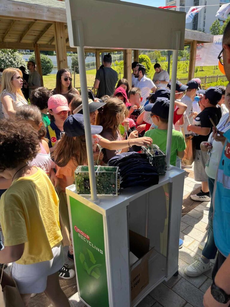 E-atıklardan yapılmış robot maskotlar, telefon ayrıştırma standı ve geri dönüştürülmüş malzemelerden oluşturulan kalemlikleri ilgiyle inceleyen miniklere; çevre bilincinin artırılması, elektronik atıkların önemi ve lisanslı geri dönüşüm süreci hakkında detaylı bilgilendirme yapıldı.